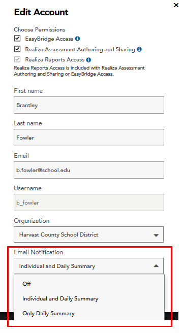 District administrators with EasyBridge permissions can modify the frequency or disable emails related to new teacher registrations for other administrators with EasyBridge permissions in the school or district. Changes are immediate, but may take up to 10 minutes to display on EasyBridge. A minimum of two administrators with full EasyBridge access must have their email notification set to receive emails for new teacher registrations. This can be two district administrators or a district and a school administrator.