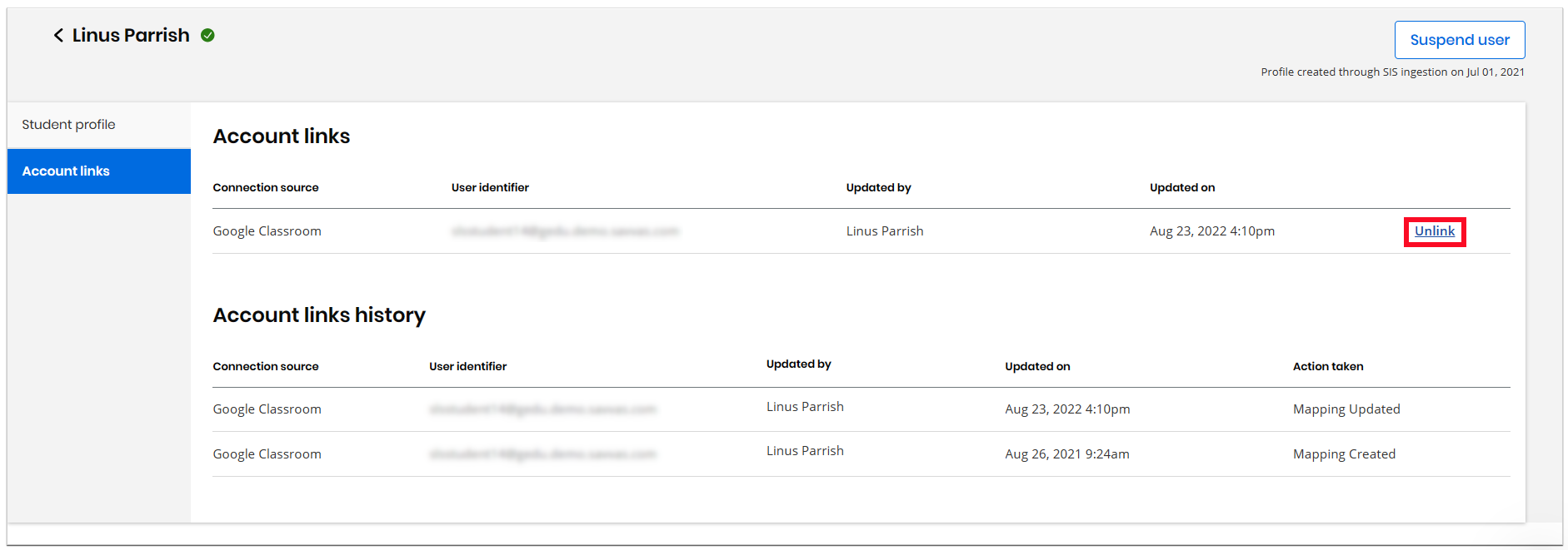 In the Account links tab, the option is provided to unlink a user account from an external source system like Google Classroom™. This may be needed if the student is linked to an incorrect account or if linked to a correct account using an incorrect email address. If an account link is removed the student can reestablish the link by opening the default Realize assignment from the Google Classroom™ class. The image below displays the location of the Unlink button in an example student's user profile.