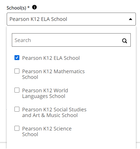 At times, it may be necessary to add or remove organization affiliations for teachers and students, such as students who move from one school to another. By selecting the School(s) drop-down menu, select or de-select organizations for a user.