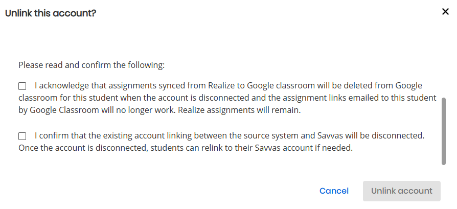 After selecting Unlink, a confirmation window appears. Verify the user account by selecting two confirmation check-boxes, then by pressing Unlink account.