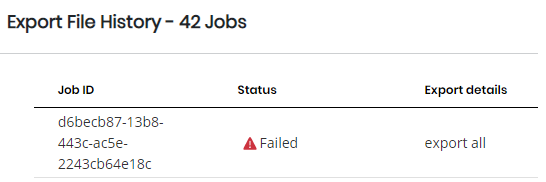 If an export is unsuccessful, the status indicates Failed for that export attempt in the Export File History. If this occurs, try again. If the export consistently fails, contact Savvas Technical Support.