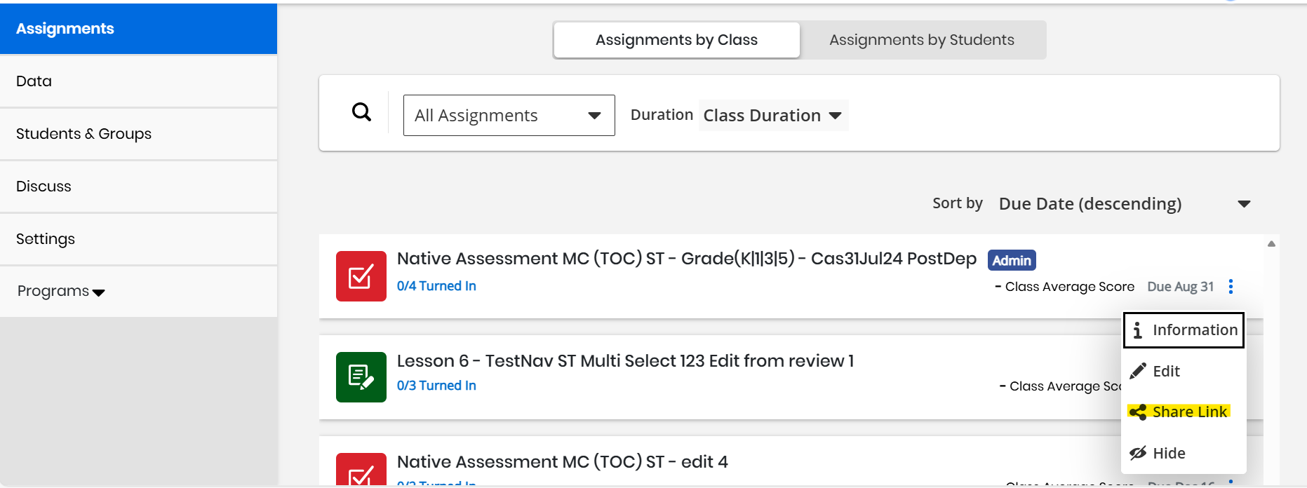 In addition, you can share an assignment using the 3-dot action menu on the Assignment Listing page and the Teacher's Preview page.