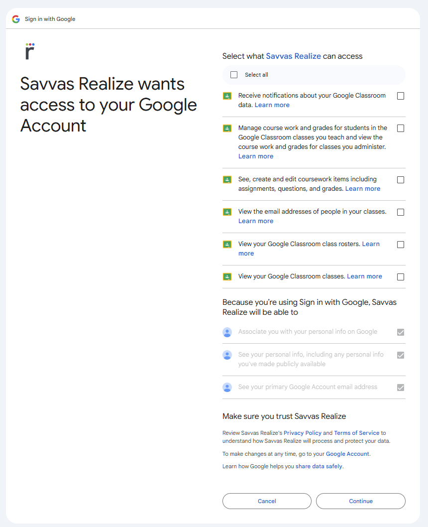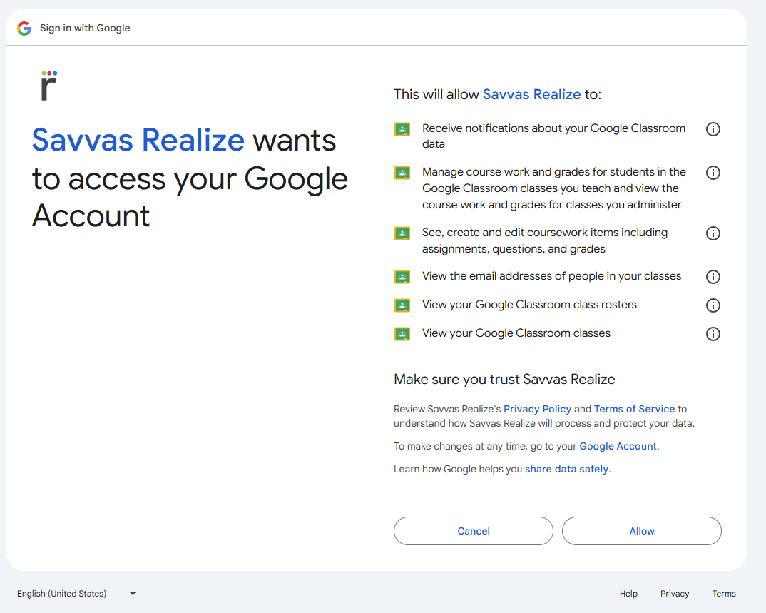 On this screen, you can review each of the permissions you're giving to Realize. These permissions allow Realize to read data from your Google Classroom™ account and to send data such as assignments and grades to your Google class only after it is connected to Realize. Select the Allow button at the bottom of the page to complete this step.