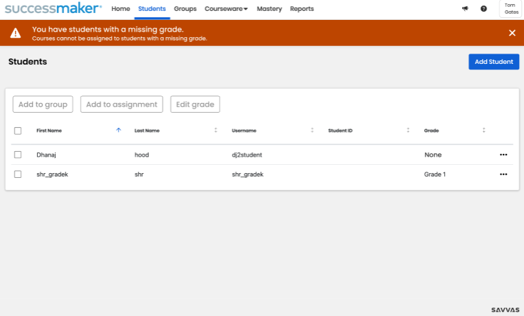 If any of your students are missing a grade level, they won’t be able to receive assignments whether assigned individually or as part of a group. To help prevent this situation, a banner alerts you on the Home, Students, and Groups tabs whenever any of your students lack this required information. It is good practice to review your student list and add grade levels as soon as possible to ensure all students can participate in assignments.